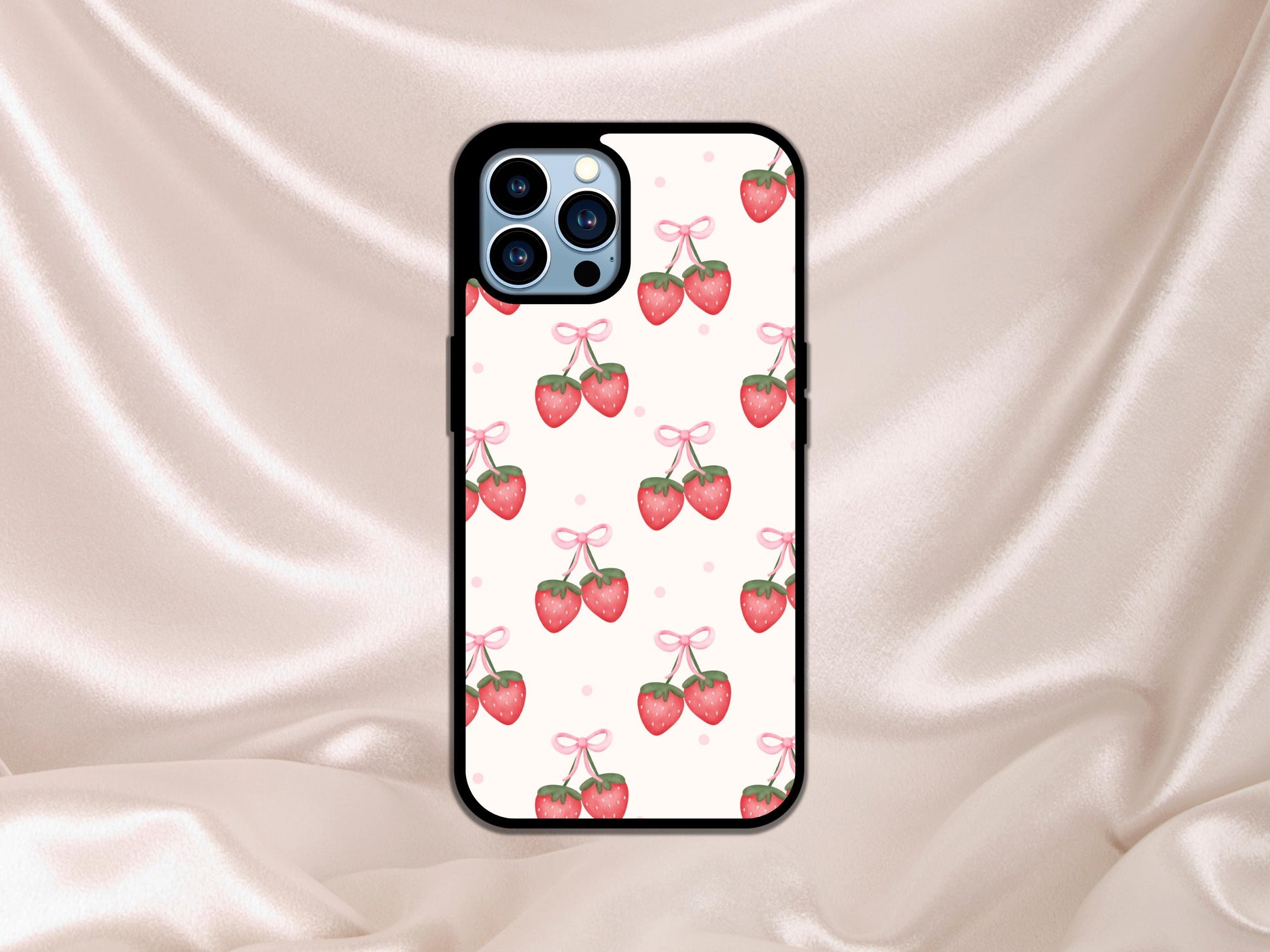 Strawberry Print Phone Case, Strawberries Pattern Plastic Rubber Phone Case For iPhone, Pink Strawberry Phone Cover, Cute Girly iPhone Cases